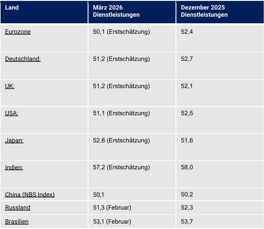 Tabelle 2: Einkaufsmanagerindices des Dienstleistungssektors im Vergleich