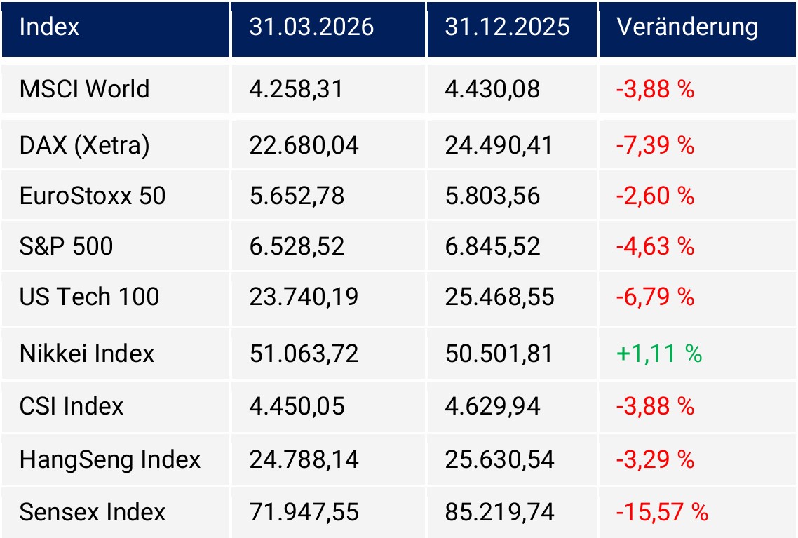 Das Winterquartal war an den Aktienmärkten zweigeteilt. Bis zum 27. Februar fielen Rekorde, unter anderem bei dem DAX, dem S&P 500 oder dem Nikkei-Index. Bereits ab Ende Januar standen Tech- und AI-Werte unter Druck. Die „Tech- und AI Story“ wurde in Frage gestellt. Mit dem Beginn des Irankriegs brachen die Aktienmärkte dann ein, um Ende März leichte Erholungstendenzen zu zeigen. Der MSCI-World Index verlor im Quartalsvergleich 3,88 %. Der DAX gab um 7,39 % nach. Der EuroStoxx 50 verlor lediglich 2,60 %. US-Märkte standen unter Verkaufsdruck. So verzeichnete der S&P 500 ein Minus in Höhe von 4,63 %. Der US-Tech 100 fiel um 6,79 %.