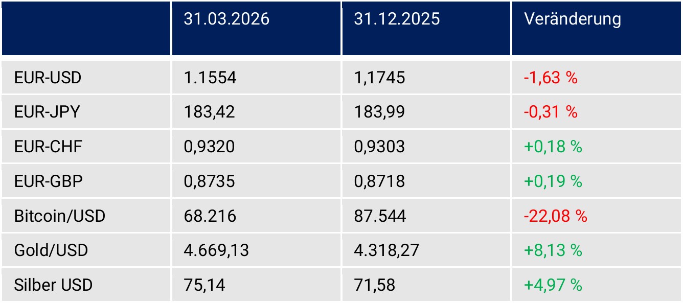 Der Euro konnte im 1. Quartal 2026 die vorherige Stärke gegenüber dem USD nicht vollständig verteidigen. Der EUR verlor überschaubar an Boden und bleibt ob der Konjunkturschwäche, der Strukturdefizite und mangelnder Reformpolitik als auch Energierisiken weiter hoch bewertet. Die Resilienz des Euros war im 1. Quartal 2026 bemerkenswert. Belastende Daten und Fakten perlten ohne substantielle Wirkung ab.